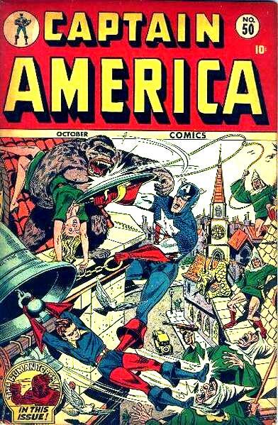 Сегодня же приключения начнутся с комикса Captain America Comics #41 за август 1944 года. Как обычно, пока что это толстые выпуски с несколькими историями от разных писателей и художников, и этот начинается с истории под названием «Твари-убийцы из Нотр-Дама». Во Франции нацисты запугивают местное население, нарядив психов, освобождённых из дурки, в костюмы горгулий и приказав им убивать. Для пущего эффекту статуи горгулий на знаменитом соборе обмазываются человеческой кровью, чтобы люди были уверены, что это статуи оживают. Глава французского сопротивления зовёт на помощь Капитана Америку (Стива Роджерса) и Бакки (Джеймса Бьюкейнана Барнса)! Герои раскрывают план нацистов, но попадают в плен, и нацисты привязывают их к огромному колоколу – герои погибнут, когда он зазвенит! Впрочем, Капитану Америке и Бакки удаётся выбраться и открыть клетки с психами, и те нападают на нацистов. «Билась нечисть грудью в груди и друг друга извела». Нацисты и психи перебили друг друга, французы довольны. В США ещё не началась волна "Буйный псих это несчастный больной человек, его жалеть нужно".