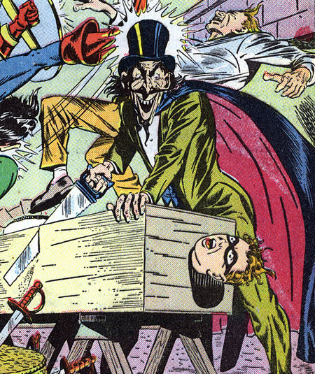 В общем, идём лучше к комиксу Captain America Comics #47 за июнь 1945 года. Начинается он с истории «Диктатор преступности». Некий Криморто, самопровозглашённый диктатор преступности, собирает армию злодеев! Его цель – уничтожить Капитана Америку и Бакки. Армия лиходеев начинает сеять смерть и разрушение по всей Америке, и конечно же, это привлекает внимание Кэпа. Похитив какую-то девушку, Криморто заманивает Капитана в свой замок, полный ловушек. Да и сам Криморто явно покруче обычного человека – может молниями из пальцев шмалять! Впрочем, как раз похищенная девушка и помогает его победить, подсказав, в чём слабость Криморто. Похоже, он лич! Ну, это слово в комиксе не звучит (да и термин этот для обозначения конкретного типа умертвий начнёт использоваться только в 1970-х, хотя само слово впервые ввёл в обиход ещё Кларк Эштон Смит в 1932 году), но слабость Криморто – в его плаще. Как только Кэп срывает с Криморто плащ, замок «Диктатора» начинает рушиться. Кэп, Бакки и девушка спасаются, а Криморто гибнет под завалами...хотя Капитан Америка уверен, что такого лиходея, как Криморто, так просто не убить. Впрочем, больше он в комиксах не появлялся.