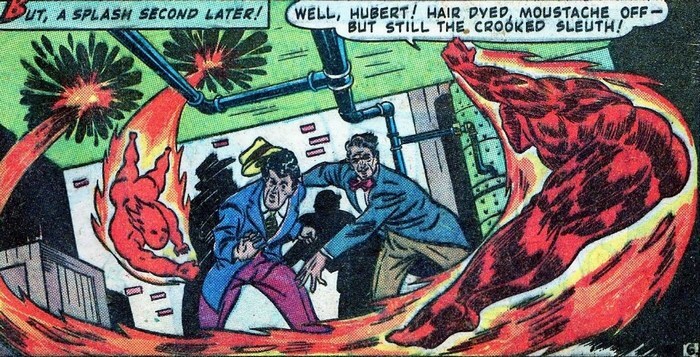 Во второй истории объявляется урод, амбал «Великий Россо» – он убивает актёров в театре, и даже похищает Бакки и планирует и его убить (почему? А хрен его знает, он же псих), но Капитан Америка спасает своего сайдкика, а Россо КОНЕЧНО ЖЕ СЛУЧАЙНО падает на собственный кинжал и погибает насмерть. А в истории про Человека-Факела сам Факел и Торо противостоят Кроту. Но не тому, который враг Фантастической Четвёрки, и даже не тому, которого Капитан Америка прищучил в Лондоне, а другому, то есть, третьему носителю этого прозвища. В сражении с ним пламенные герои оказываются практически бесполезны – Крот вырубает их с помощью хлороформа и упаковывает в смертоносную центрифугу. Так бы они там и погибли, если бы не подоспели агенты ФБР. Освободившись и поблагодарив агентов, пламенные герои успевают обезвредить заложенную Кротом бомбу. Агенты ФБР в это время арестовывают Крота и расстреливают на месте всех его приспешников во имя справедливости.