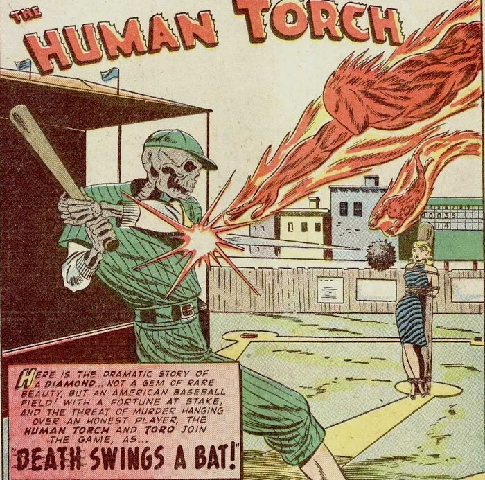 Главзлодеем второй истории оказывается зловещий Матадор! Ярко одетый злодей похищает самоцветы и убивает людей, а его бомбы с усыпляющим газом делают погоню за ним проблематичной. Конец его истории написан в лучших традициях ранних 1940-х – кровью. Получив по голове от Капитана Америки, Матадор пятится, спотыкается, падает в бушующее пламя (дело происходит в горящем здании) и сгорает заживо в диких муках с душераздирающим воплем. Кстати, об огне: в третьей истории Человек-Факел и Торо расследуют загадочное убийство, которое произошло во время бейсбольного матча. Оказывается всё довольно прозаично – один спортсмен отказался за большие деньги проигрывать, вот его и грохнули. Мошенников-убийц пламенные герои ловят, прогревают (не смертельно) и сдают полиции.