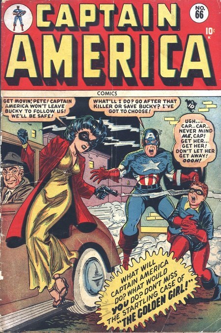 И снова Бакки в беде, на сей раз на обложке комикса Captain America Comics #66. В городе объявляется злодейка по прозвищу “Лаванда”! В процессе сражения с её бандой Бакки своей тушкой ловит пулю, так что вместо того, чтобы ловить Лаванду, Кэп отвозит партнёра в больничку. Но один в поле не воин – Кэпу нужен помощник. Так что Капитан обращается...к Бетси Росс. “У тебя как с физухой, вроде же норм? – Да вродь не жалуюсь. – ЗБС, пару уроков рукопашки, костюмчик, и будешь моей новой спутницей, пока Бакки лечится”. Бетси совсем не против, и так появляется новая линчевательница, Золотая Девушка! Она очень даже на отлично нокаутирует Лаванду, пока Кэп месит прихвостней, после чего Кэп раскрывает Бетси свою личность (ну, что он “Стив Роджерс”) и они целуются. А Бакки отлёживается в больничке, ему не до героизма.