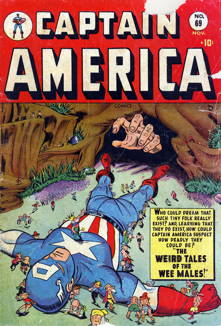 Так что радуемся и переходим к комиксу Captain America Comics #69. Джефф “Стив Роджерс” Мейс же всё ещё учитель в школе. И вот, рассказывает он школоте о странствиях Гулливера. А школота не принимает, мол, “нириалестична”. Тогда он рассказывает о приключении Капитана Америки. Короч, однажды самолёт Кэпа потерпел крушение и сам Кэп попал в страну лилипутов. Там ему были рады все, кроме министра Гринко. Мелкий говнюк собрал против Кэпа целую армию, но вот уж мелочь всякую даже ненастоящий Капитан Америка раскидать может. По итогу мини-народец понял, что Гринко – плохой лилипут, его гнали и насмехались над ним, а Кэп улетел, пообещал не возвращаться и не рассказывать никому, где находится страна лилипутов. Этой истории школота, кстати, поверила.