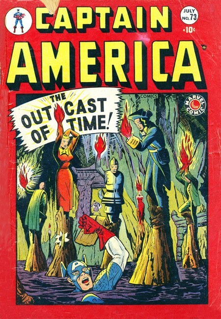 Психоделом украшена обложка комикса Captain America Comics #73. В Центральном Парке Нью-Йорка пропала девушка! Не то чтобы это было такое уж редкое явление, просто на сей раз девушку похитили с помощью высокотехнологичной прибамбасины. Улики указывают, что преступник, Вольф Терб, доставил девушку в тайные помещения местного санатория. Там Капитан Америка встречает человека по имени Сан, гостя из 2548 года, который утверждает, что Вольф – тиран из будущего, стремящийся захватить власть в прошлом, а сам Сан прибыл, чтобы его остановить. В погоне за Тербом Кэп и Сан посещают сначала 18 век, потом 17, затем летят в будущее, в 36 век, где бушует война, и наконец, добираются до 200 000 года, года предсмертной агонии планеты Земля. Догнав Терба, Кэп нокаутирует его с одного удара, разбив ему голову к чертям (Терб оказывается роботом), после чего настраивает машину времени на возвращение в 20 век и самоуничтожение (чтобы никто больше этой технологией не воспользовался).
