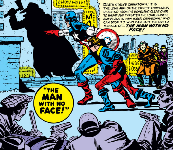 Во второй истории Кэп и Бакки ищут агента коммунистов по прозвищу “Безликий” – он угрозами принуждает живущих в Нью-Йорке китайцев спонсировать коммунистический Китай, угрожая убить их близких, оставшихся в Китае. Он даже шантажирует полицейского, Винга, угрожая убить его брата. Кэп и Бакки берутся за расследование, спасают нескольльких китайцев, на которых нападают прихвостни Безликого, и наконец, находят самого Безликого. Против силушки Капитана Америки Безликий оказывается бессилен, и в финальном сражении на крыше раскрывает свою личность – Безликим оказывается брат офицера Винга! Впрочем, пропустив пару “входящих” от Кэпа, Безликий падает с большой высоты и убивается насмерть. Герои решают не раскрывать офицеру Вингу личность Безликого (тем более, упал он на голову, так что уже и не опознать), и тактично сообщают, что брату в Китае больше ничего не угрожает.