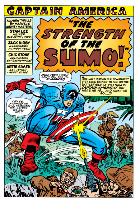 А на сегодня приключения Кэпа порат завершать, и для этого подойдёт комикс ToS #61 за январь 1965 года, опять-таки, с сегментом про Кэпа от Стэна Ли и Джека Кирби. Фёдор Конюхов, когда ему скучно, отправляется на лодочке через Альпы, или на козе через Тихий океан, а Капитан Америка, чтобы не скучать, отправляется во Вьетнам бить злых узкоглазых. Ну ладно, не совсем от скуки – размотав нехилый отряд, он зовёт главнюка и требует проведения переговоров и освобождения пленного американского пилота. Главнюком оказывается майор, и когда двух его сильнейшихъ амбалов Кэп избивает, как нубасов, майор пропускает Стива к генералу, злорадствуя, что никто не уходит от генерала живым.