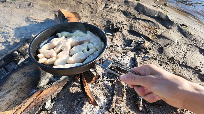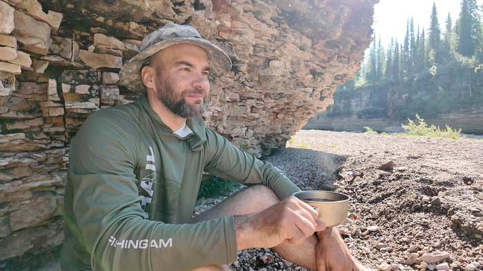 На обед встали в 14-00 на излучине реки. Тарас тут же наловил рыбы для прибавки к рациону. Готовили долго из-за ветра, но и отдохнули лучше.