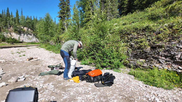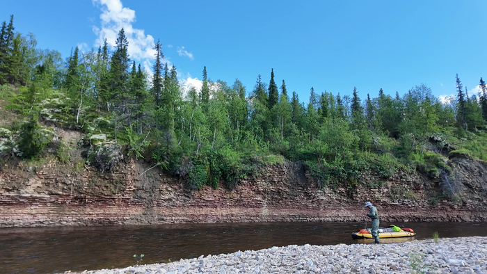 Сегодня были все шансы выйти пораньше, но перед погрузкой Тарас обнаружил на дне пакрафта потёртости, потратили время на заклеивание временными латками. На воду встали только в 10:45.