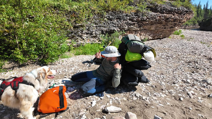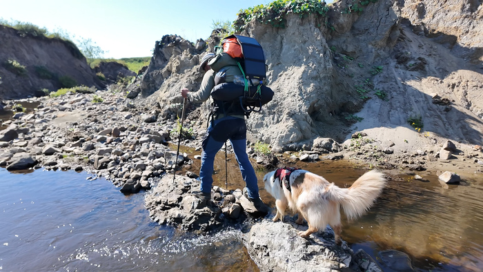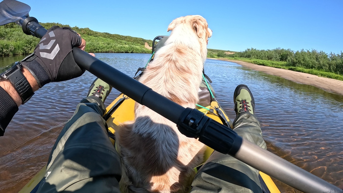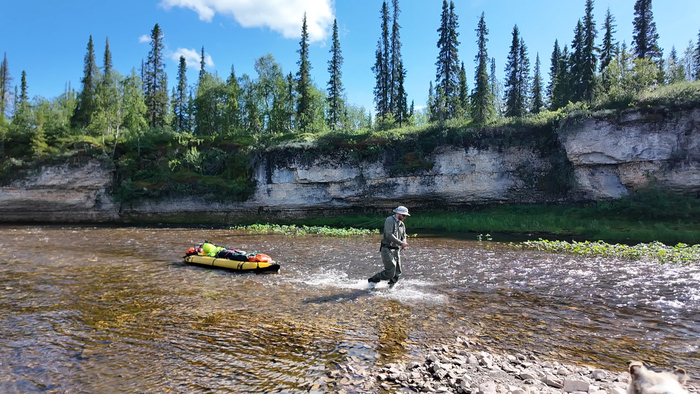 Переоделись в "вейдерсы", забродные ботинки и вышли на воду в 12-30. Тарас решил пока идти одним пакрафтом, поэтому он тянет полностью загруженный Жаворонок XL, я и Марс идём берегами, заходя в реку только у прижимов.