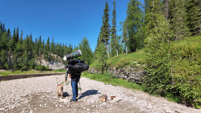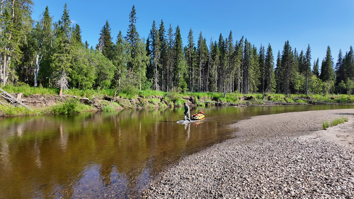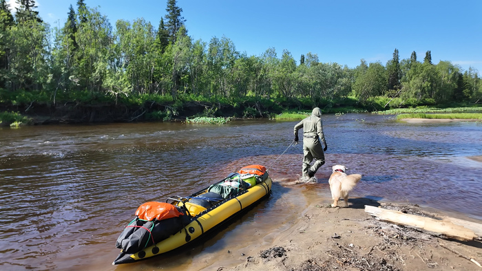 Выход в 10:40. Оба с рюкзаками по 15 кг, пёс налегке. К моменту выхода ясно, но сильный северный ветер. В месте стапеля река для сплава не пригодна, и даже проводка даётся нелегко — почти все перекаты переносим пакрафт вдвоём за нос и корму.