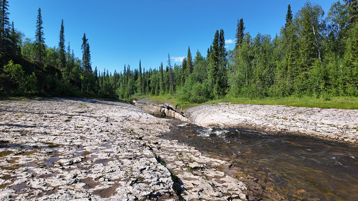 Наконец выбрались из каменного лабиринта и вышли к Белому Кечвожу. Река здесь ещё мелкая, но Тарас решает побросать спиннинг — а вдруг!