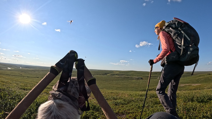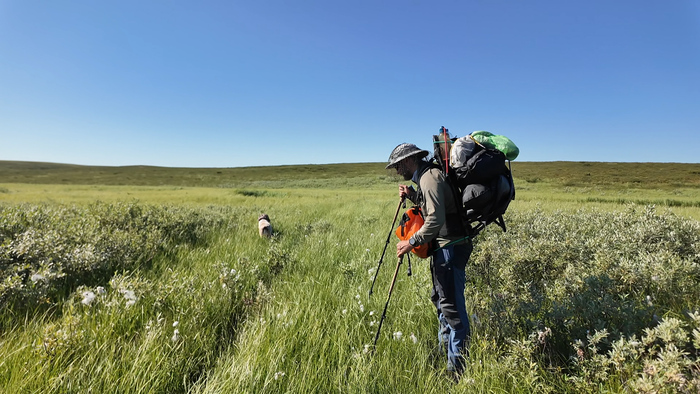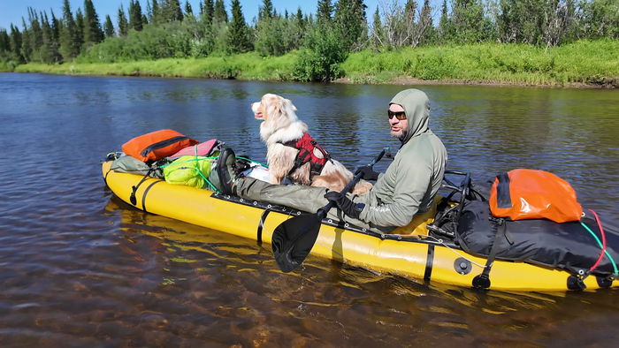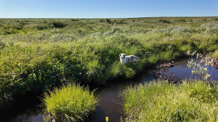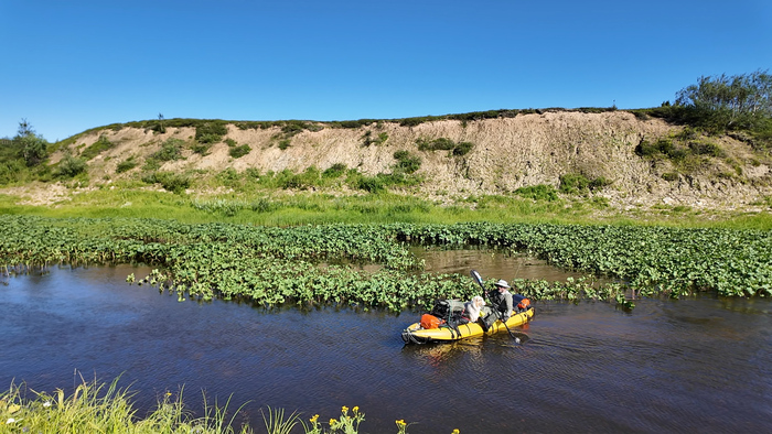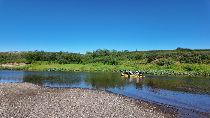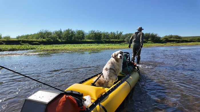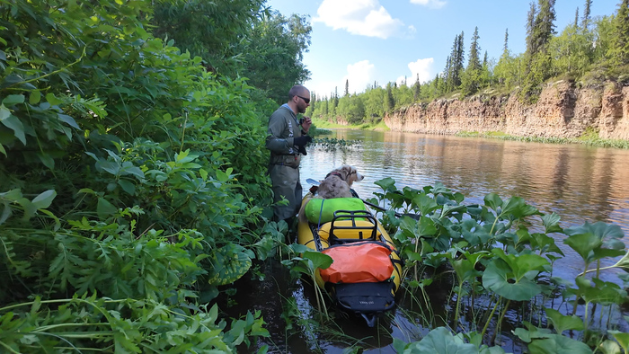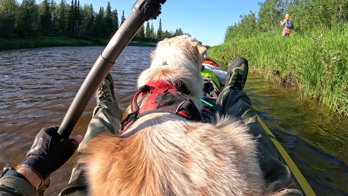 Продолжаем идти одним пакрафтом, Тарас по воде, я берегами, Марс по большей части пассажиром.