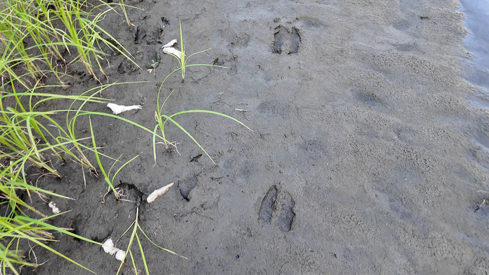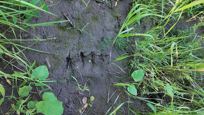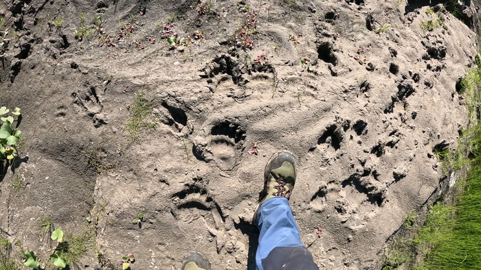 Дважды неверно «прочитала» реку и не перешла вовремя на другой берег, пришлось продираться через ивовые заросли с высокой травой — те ещё джунгли. По пути встретила первые следы медведя в этом походе.