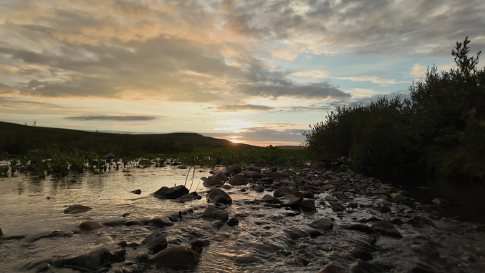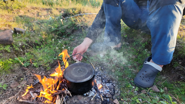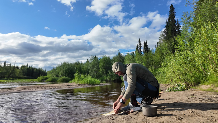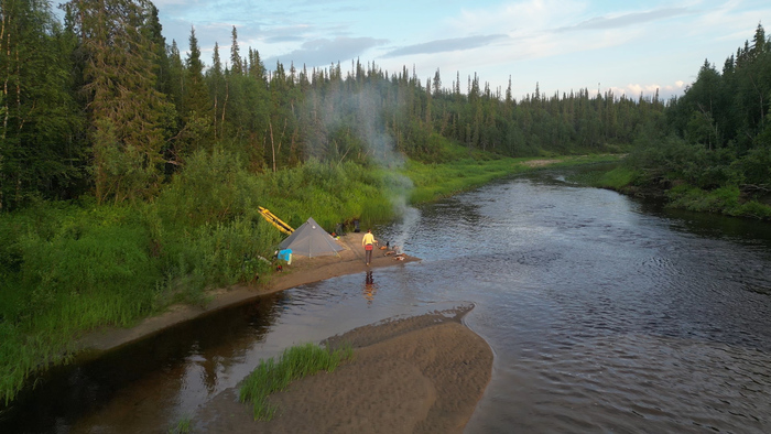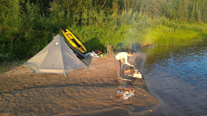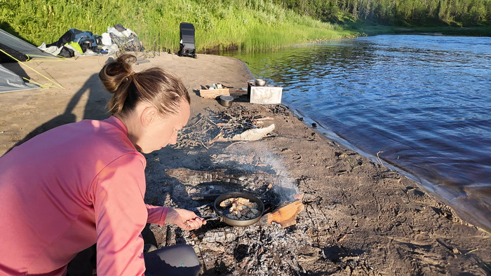 День 24. Дневка в устье Кумушки Тепло и солнечно. Просушка вещей и пакрафтов, стирка, хорошая рыбалка, оладьи, жареная рыба, чай, красивый закат.