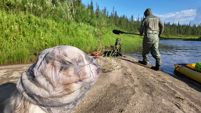 Лодка подошла в намеченное время, но за время ожидания комары и мошки доходчиво объяснили, чего ожидать от них в походе. Впечатлило!