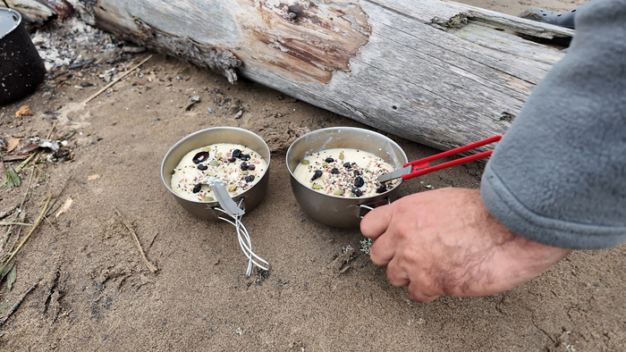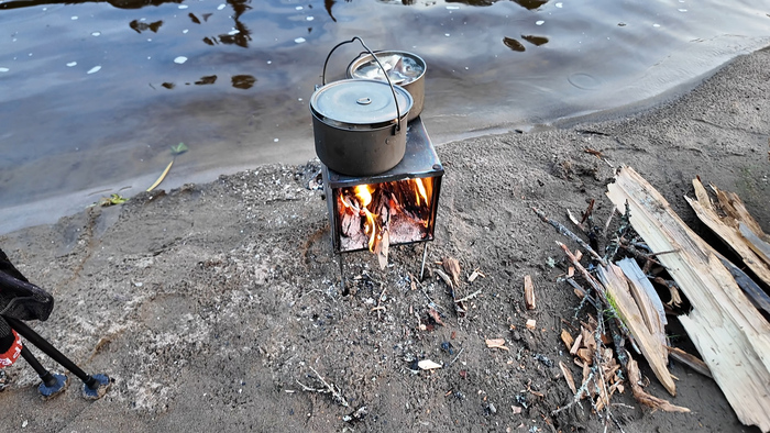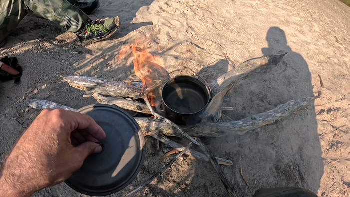 Вернулись к вещам, на остатках вчерашних дров закипятили котелок, пообедали.