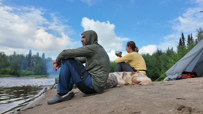 Сегодня и так идти не собирались, а с такой погодой тем более. После завтрака Тарас отправился на перекат, сводить счёты с одной знакомой хитрой щукой, никакой дождь остановить его не в силах. А я тем временем забралась с Марсом в уютный ворох спальников, как же сладко поваляться в тепле под шелест мороси по палатке.