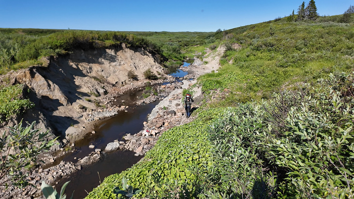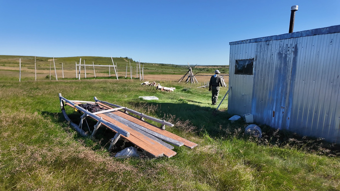 Вытащили пакрафт на берег и отправились на поиск вездеходной дороги. Обнаружили её сразу, как поднялись из русла в тундру. Отсюда же увидели пустующее стойбище оленеводов на противоположном берегу.