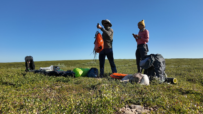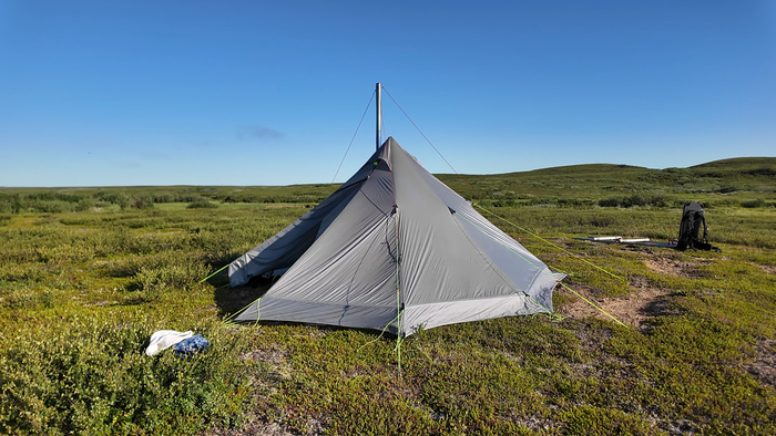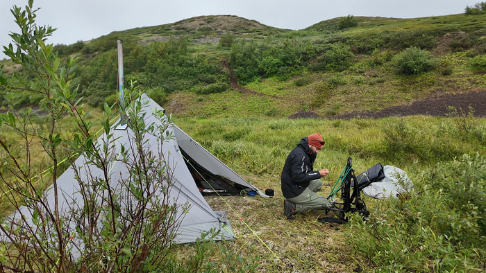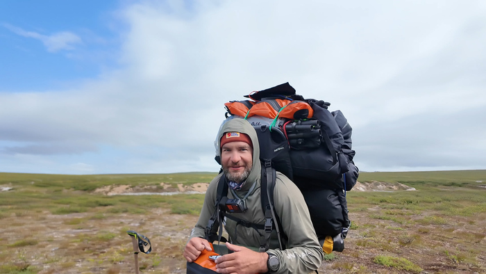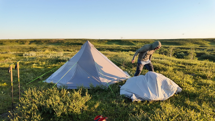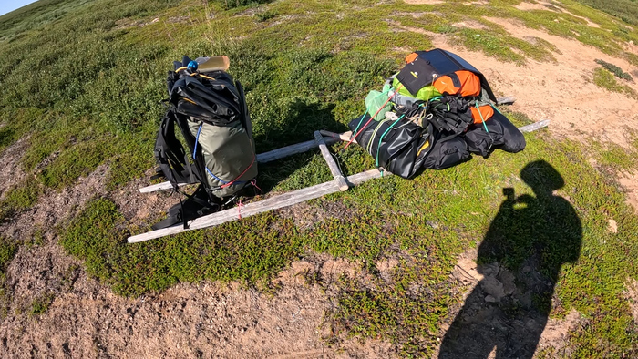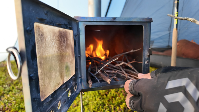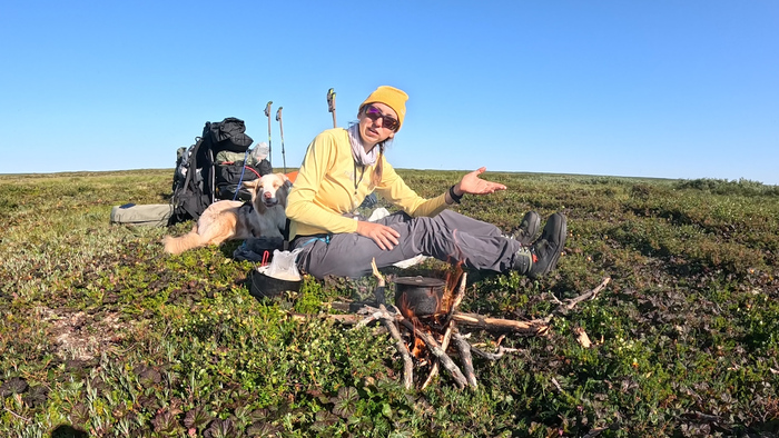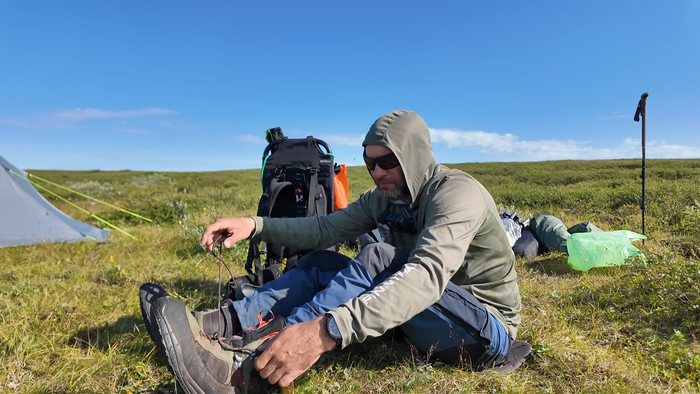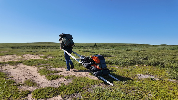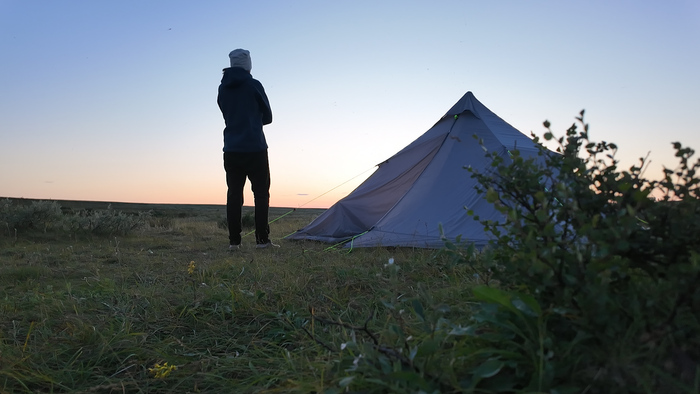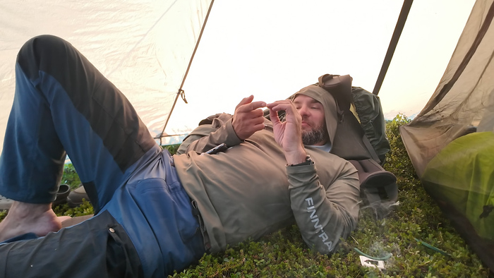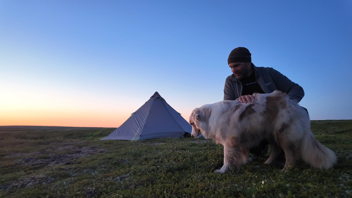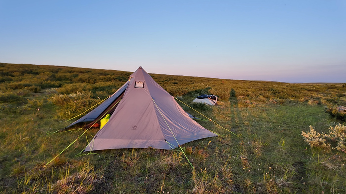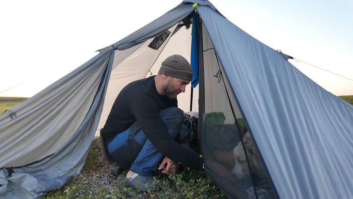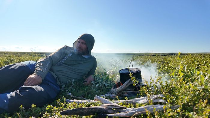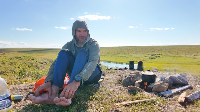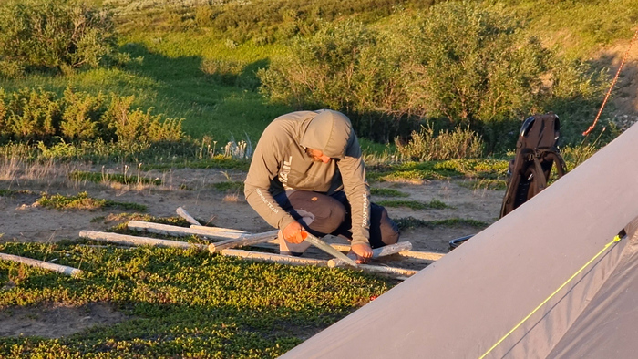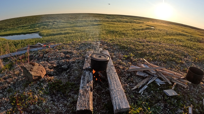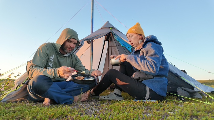 Выбрали удобное место под палатку, объели голубику - наконец встретили ягоды. Тарас собрал печь, чтобы не разжигать костёр в сухой тундре и прогреться перед сном — последние ночи неожиданно холодные.