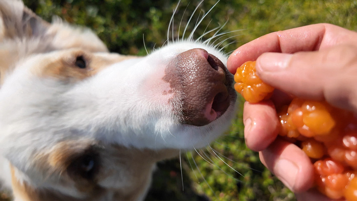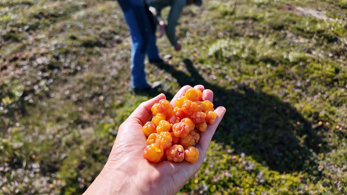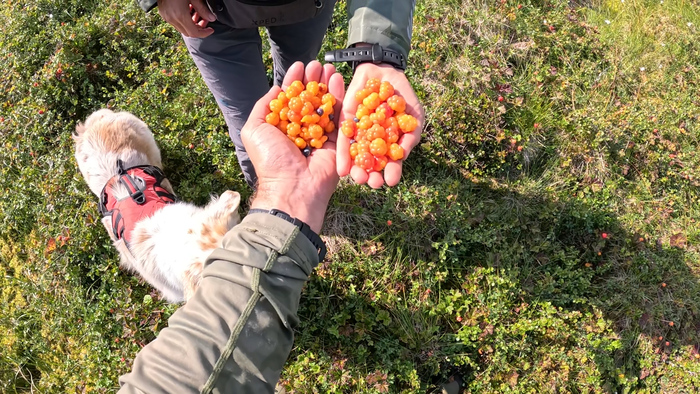 Через 800 метров от старта попали на поляну спелой морошки. Испытала какое-то детское чувство радости от изобилия. С азартом набросились, но уже через десять минут наелись досыта.
