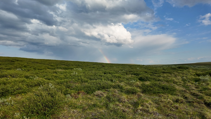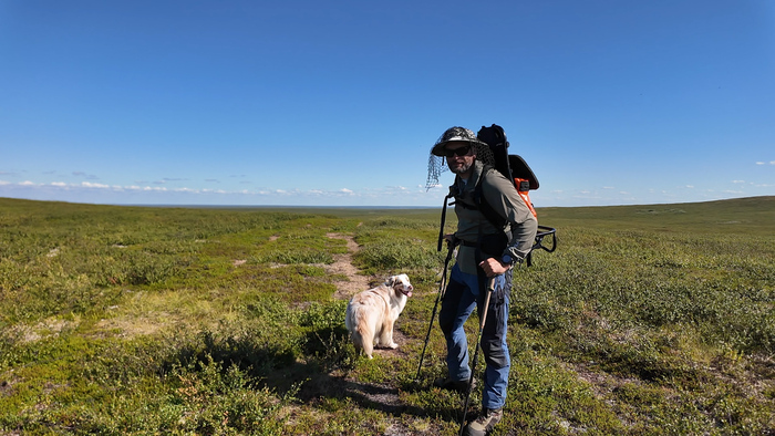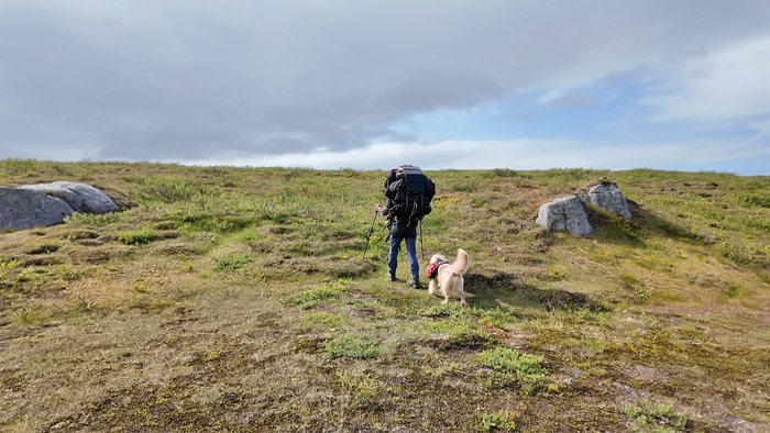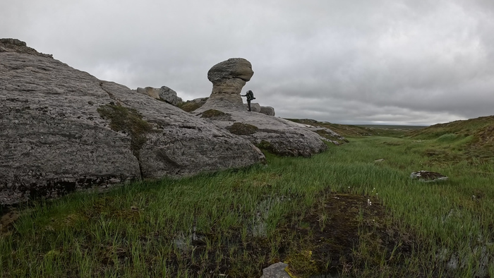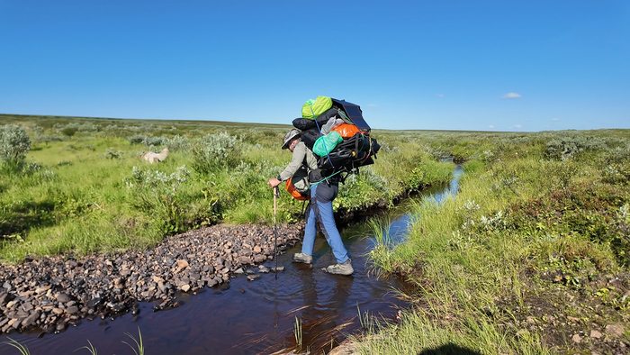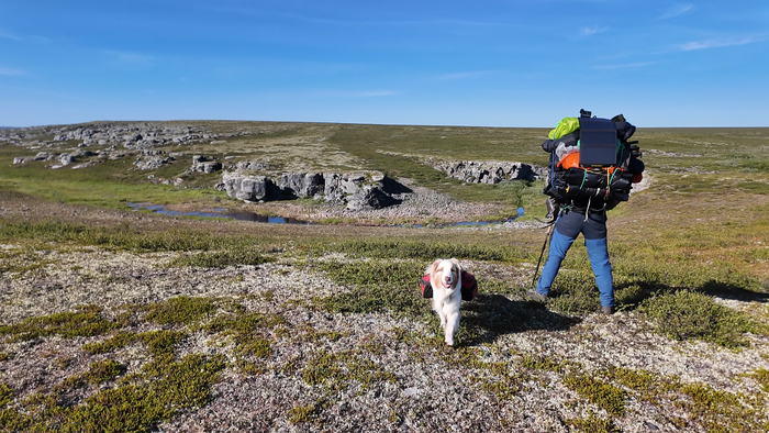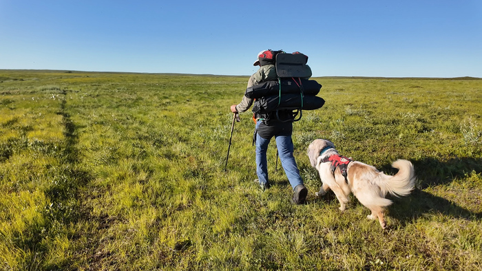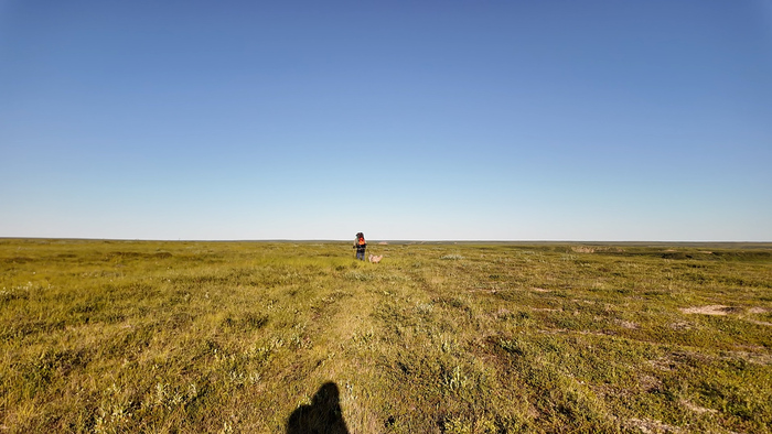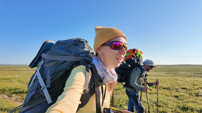 Первую часть пути идём под приятным охлаждающим ветром по вездеходке и по практически сухой тундре. Идём достаточно бодро, первые 2 часа километры отщелкиваются.В районе полудня уходим с вездеходки на "целину", чтобы прийти к Каменному городу. Скорость сразу упала - по кочковатой тундре без дороги идти сложно.