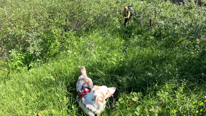 Опять ошиблась и вовремя не перешла реку, пришлось уходить высоко на крутой склон, чтобы обойти низинные ивово-берёзовые джунгли. Какие-то 200 метров умотали и меня и Марса.