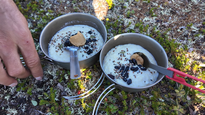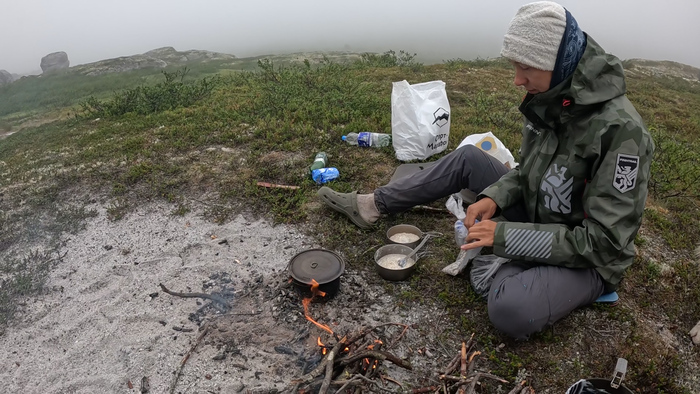 Кипятим воду на кофе, варим овсянку, собираемся и выходим в 10:40.Сегодня идти всего 6 км, но местность пересечённая, и у Тараса рюкзак 60+ кг, значит, километры дадутся непросто.