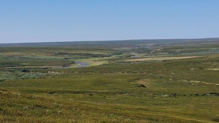 Поднялись на перевал. Сняли рюкзаки и уставились на открывшиеся виды: впереди меандры Щучьей, справа вдали угадываются очертания чума, а на все 360 градусов бескрайний простор.