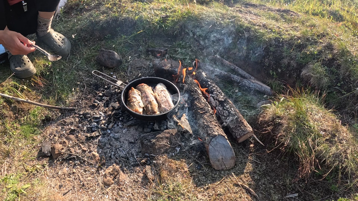 Тарас вернулся в 14:55 изрядно уставшим, зато обедали, ужинали и на следующий день перекусывали вкусным жареным хариусом.