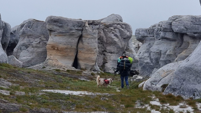 Дошли до города, сняли рюкзаки, побродили по закоулкам с фальшфейерами и свистками в руках — много следов медведя и растерзанная в камнях туша домашнего оленя.