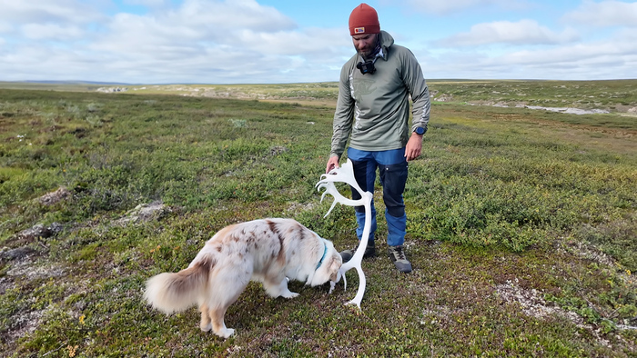 Первый привал на косе, где днём ранее Тарас поймал рыбу своей мечты. В этот раз кумжа не клюнула, зато вышло небольшое стадо любопытных и опасливых оленей.