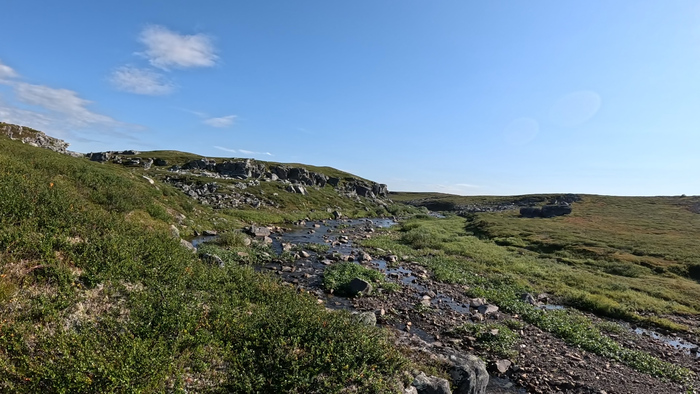 Морошка есть, но ещё совсем незрелая. Заметили, что на этой высоте почти нет никаких зрелых ягод. В 14:30 встаём на обед на хорошем ручье перед подъёмом к долине Белого Кечвожа.
