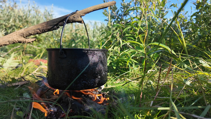 На стоянку пришли как раз к обеду. Место хорошее — ровная поляна, хороший обзор, до воды рукой подать.