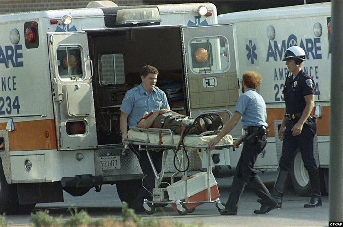 Через несколько минут на тротуар между ранеными и зданием въехал первый экипаж скорой помощи AmCare; вскоре за ней последовали остальные. Всех оставшихся раненых «в темпе» погрузили в машины, которые, завывая сиренами, понеслись в Госпиталь Милосердия.
