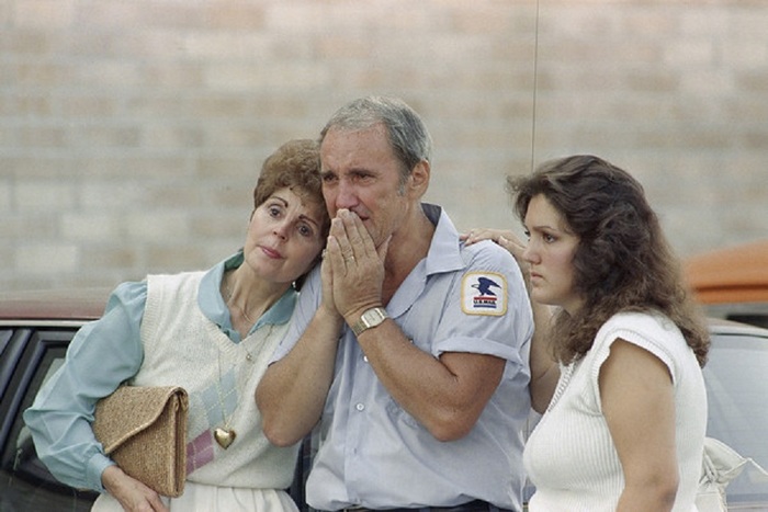 Сотрудники почтового отделения г. Эдмонд скорбят. Интересно, что хотя автор книги «Пятнадцать минут ужаса» (источник 11) Дейл Юстус нигде не упоминает, что его фотографировали после того, как он покинул здание- но на снимке, судя по всему, изображен именно он.