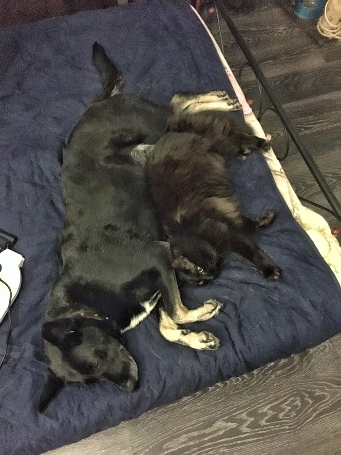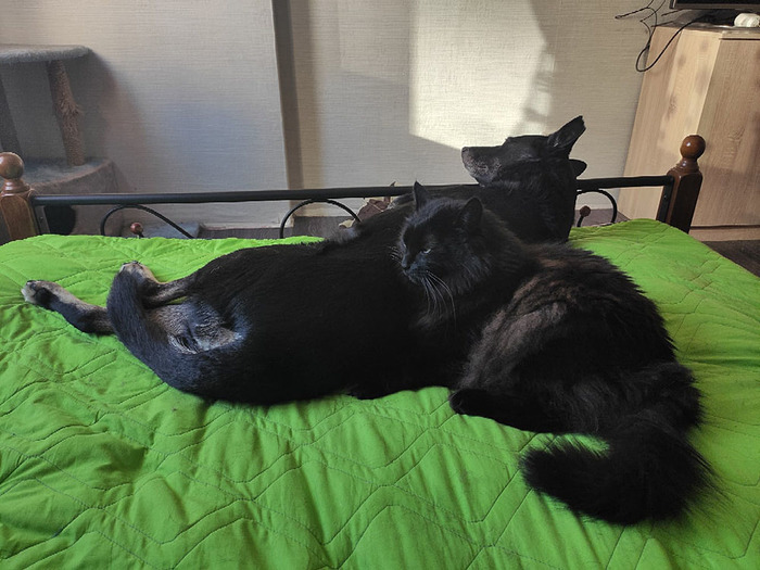 С котами договорились о нейтралитете. Хотя несколько инцидентов всё же было. Но в итоге победила дружба. И теперь в жизни у Чучи 2 глобальные неприятности. Первая это когда она иногда спит на кухне. И вторая - это приставания одного чёрного мохнатого нахала. Да, иногда на Ыша находит и он подкатывает к Чуче. Так что в итоге жизнь у собаки стала скучной, зато домашней.