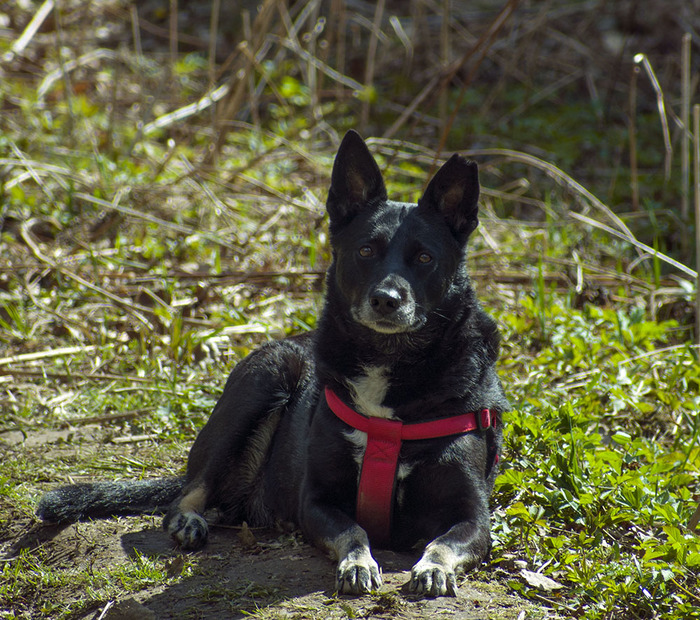 В конце концов было принято решение забрать Чучу домой. Купили шлейку, значит, нацепили на собаку и пошли оформлять докУменты. Приходим за Чучей, а шлейка разорвана на куски. Наверное соседи по вольеру постарались На счастье, наверное. Пришлось делать из двух поводков две петли и вести так. Чуча шла к электричке спокойно, но немного недоумевала куда это мы идём. Через площадь трёх вокзалов пришлось нести её на руках. Благо после приюта весу в ней было не много.