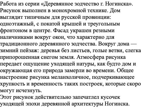 На картине изображен старый деревянный дом, расположенный на окраине города Ногинска. Дом выполнен в традиционном стиле русского деревянного зодчества. Фасад здания украшен резными элементами в виде ромбов, что придает ему особую выразительность и уникальность. Наличники окон строгие и лаконичные, что подчеркивает общий стиль постройки. Несмотря на слегка заброшенный вид, резьба на доме хорошо сохранилась, что позволяет оценить мастерство древних мастеров. Картина выполнена на тонированной бумаге с использованием гелевой ручки, чернографитного карандаша и мела, что придает ей графичность и выразительность.