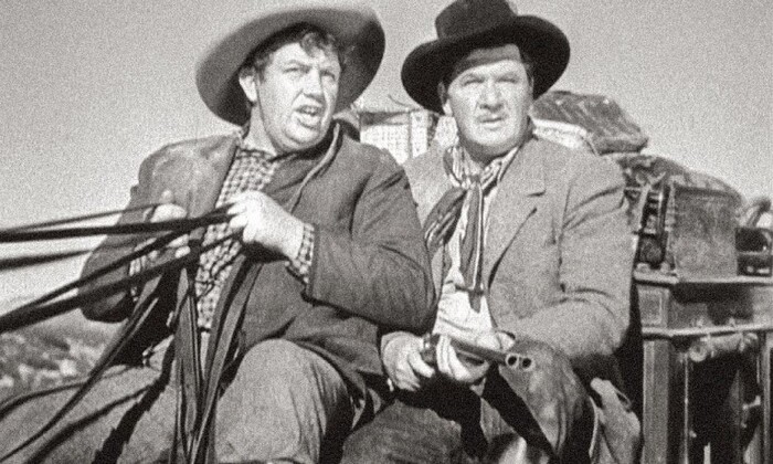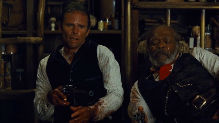 Рекламный кадр Томаса Лютера Прайса (Роберт Калп) с револьвером Адамса и Ханни Колдер (Ракель Уэлч) с револьвером Трантера.