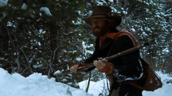 Бретт Шервуд (Алан Лэдд) держит карабин Мейнарда на рекламном изображении.
