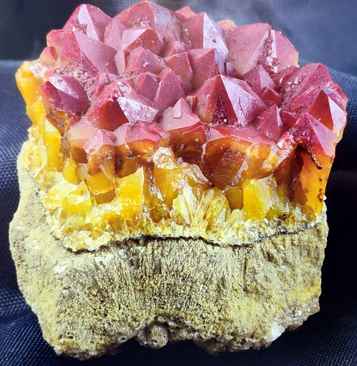 Но на поперечном сколе или спиле открывается более разнообразная и пестрая картина - чередование различных зон: аметистовой окраски, красной и желтой со сноповидными и игольчатыми включениями гетита, лепидокрокита, какоксенита, зонами и участками окрашенными желтыми и оранжевыми примесями гидроокислов железа, участки, обогащенные окислом железа гематитом с ярко-красным цветом... В общем, всевозможные включения в кварц, связанные с минералами железа. Всё это великолепие образовывалось при достаточно низких температурах, о чем свидетельствует карбонатная основа друз и встречающиеся "слойки" из железистых карбонатов анкерита и сидерита.