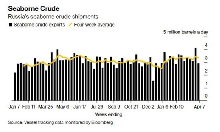 Но в марте ситуация меняется. Морской экспорт сырой российской нефти за последнюю неделю упал почти на 14%. Bloomberg, неустанно бдящий за чёрным золотом и верностью санкциям, с радостью заявляет, что перевозки нефти в среднем за последние четыре недели упали до 3,3 млн баррелей в сутки.