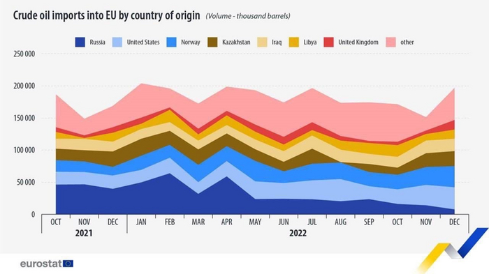 Например, российская нефть опять выдаёт фортели. Нефтепереработка в России в феврале увеличилась на 0,2% по сравнению с январём, около 779 тыс. тонн в сутки, и это несмотря на эмбарго, на продукты переработки.