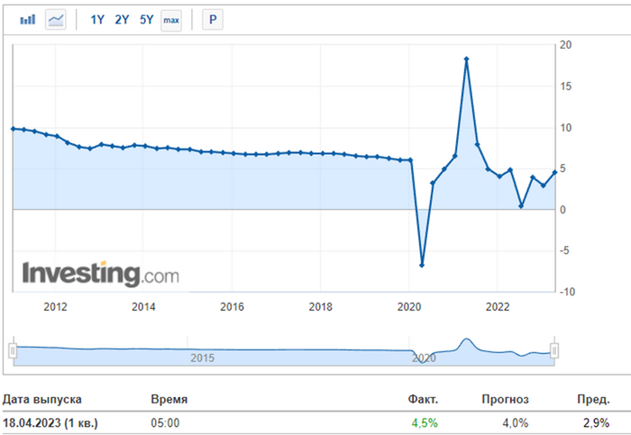 Рост ВВП ускорился до 4.5% г/г против 2.9% в 4 квартале 2022 года. Рост ВВП выше роста розницы и производства, т.к. реальные розничные продажи за 1 квартал показали рост 4.3% г/г, производство прибавило 2.9% г/г.