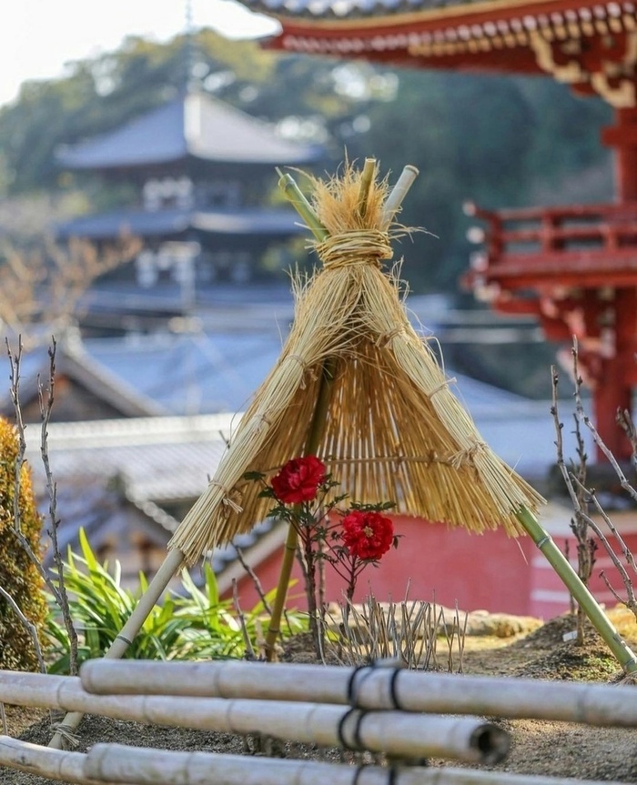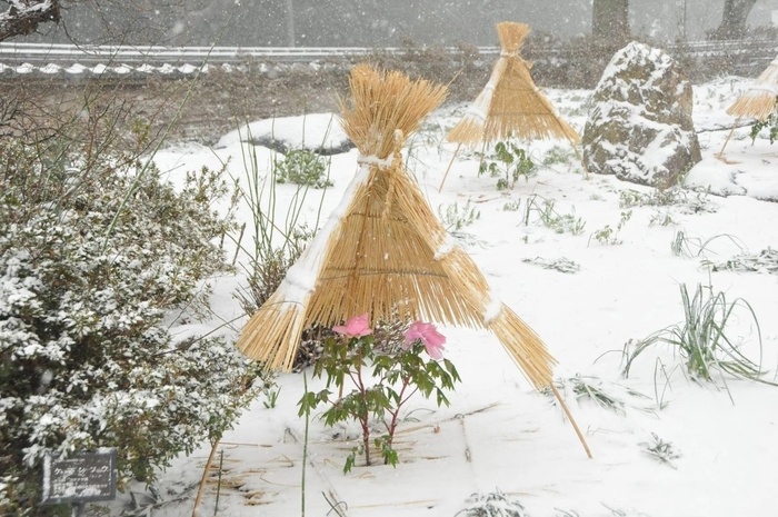 Нежные бутоны пионов и пушистый снег — удивительное сочетание, а защитные плащики из соломы - варабоши わらぼうし ( わら帽子 ), только добавляют очарования…