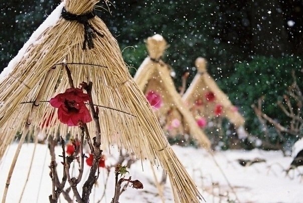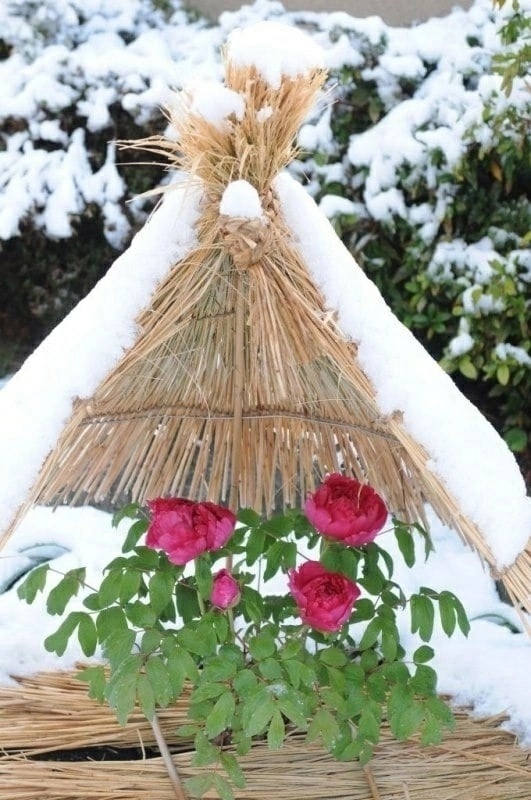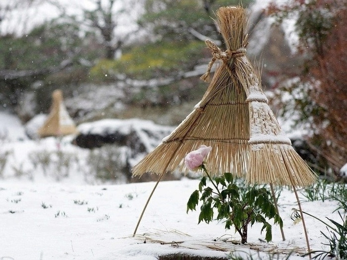 Японские пионы цветут даже под снегом ! Главное – прикрыть нежные цветы соломенными накидками, чтобы тяжёлые хлопья снега не поломали бутоны.