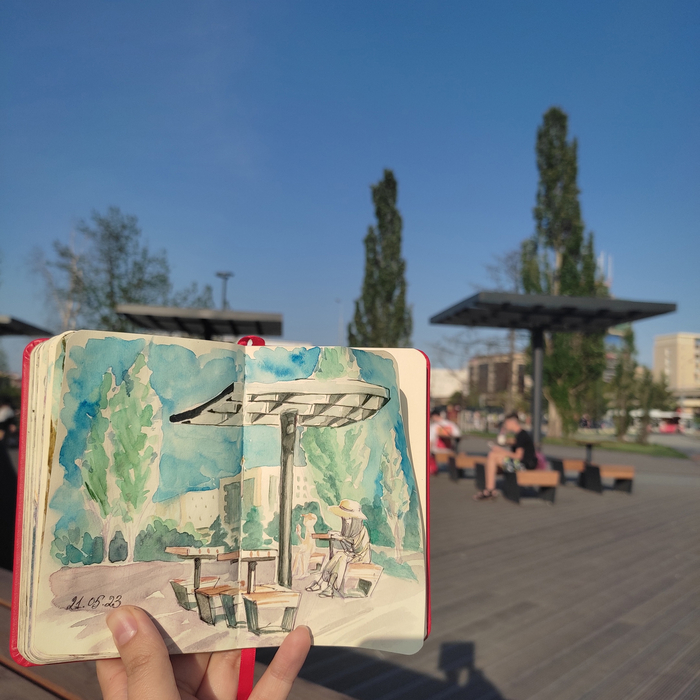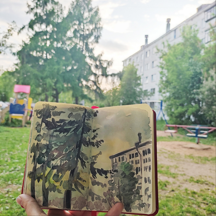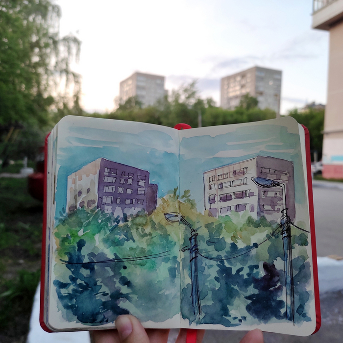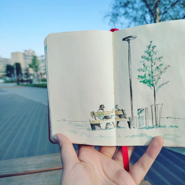 Рисовальный лайфхак, который я открыла для себя недавно, и с тех пор пользуюсь. Быстрее и проще получаются те скетчи, которые рисуются с какого-то далёкого объекта. Во-первых, потому что далёкий фрагмент реальности проще скомпановать на плоскость бумаги. Рисунок сразу получается более целостным, и не надо переживать, что какой-то кусок не влез. А во-вторых, вдалеке не видно кучи деталей, которые вблизи хочется нарисовать обязательно прям все (в них проще запутаться, а большое количество деталей перегружает рисунок).