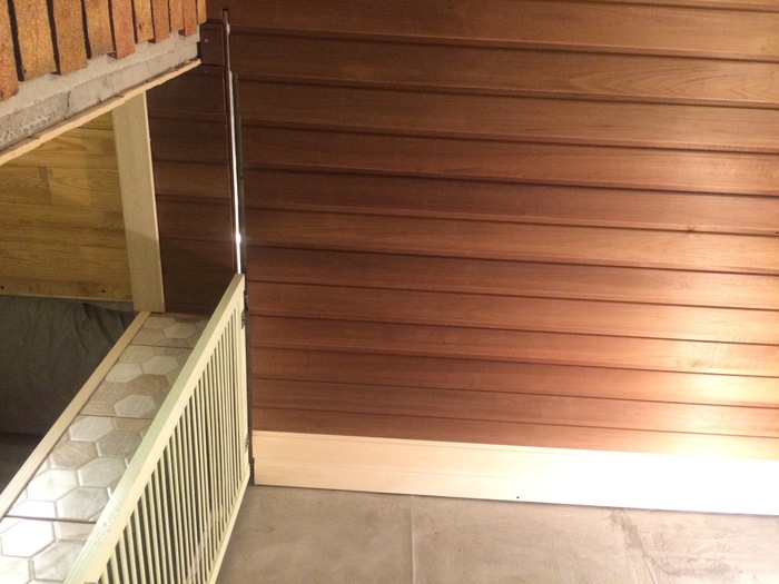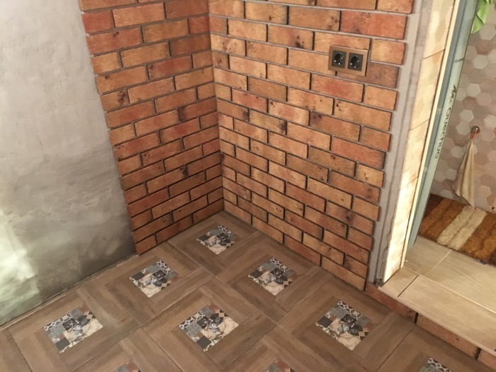 с этой стороны, где должен быть котел, установил остечку из минерита и начал клеить клинкерную плитку.