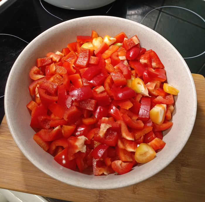 Пока томятся ножки, можно заняться подготовкой остальных ингредиентов. Перец нарезаем брусочками и/или квадратиками.