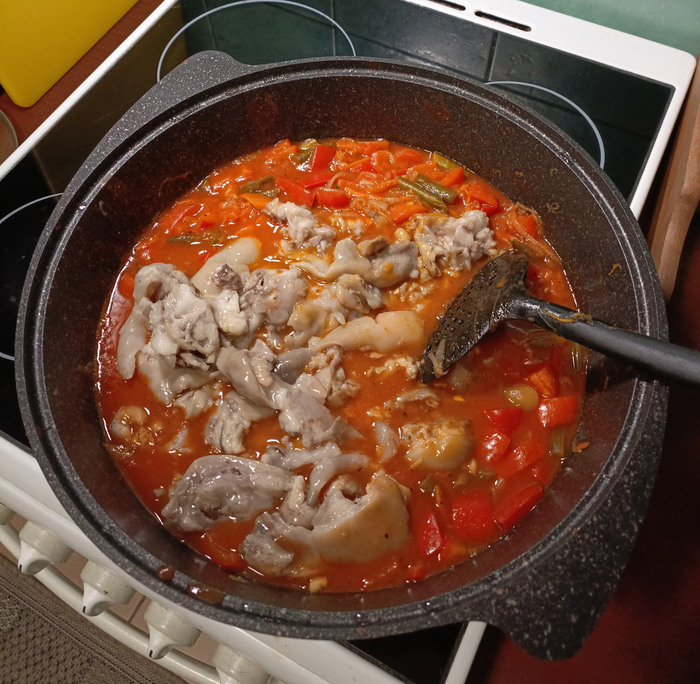 Пришлось задвинуть подальше мечты о хрустящей сладкой свиной шкурке и вернуться к венгерской вариации приготовления ножек, тушёных в томатном соусе со сладким перцем, морковью и луком.