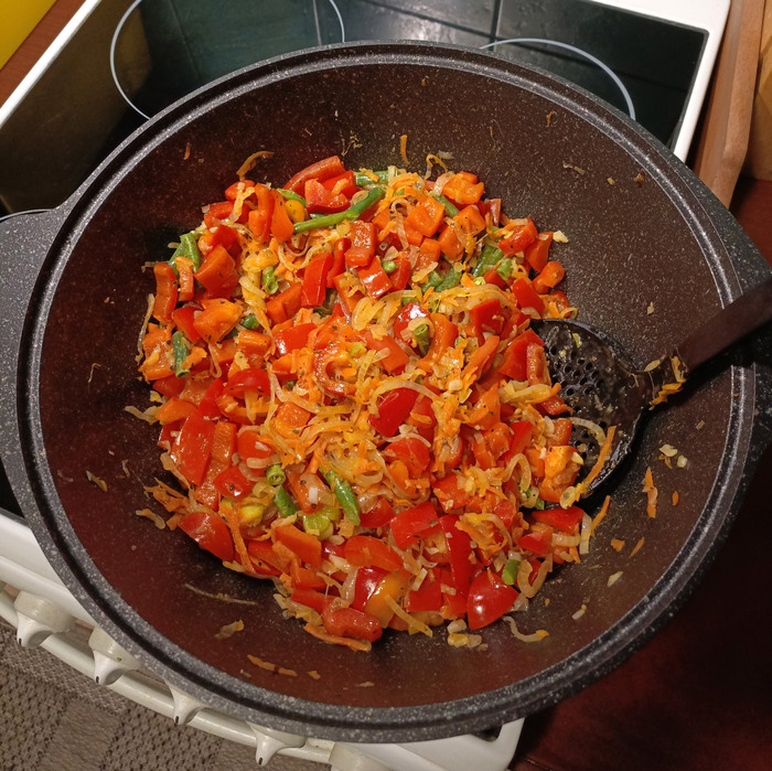 Забрасываем основной ингредиент — сладкий перец. Ему на качественную обжарку требуется времени заметно больше, чем луку с морковкой. Не ленимся периодически ворочать, чтобы не пригорело. Минут через пять после закладки перца можно всыпать фасоль.